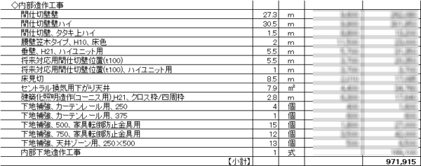次の見積りは、内部造作の見積りになりますが、室内の壁も1mごとの単価が決まっていて、単価×壁の長さで計算されています。また下地補強の費用も細かく計算されています。